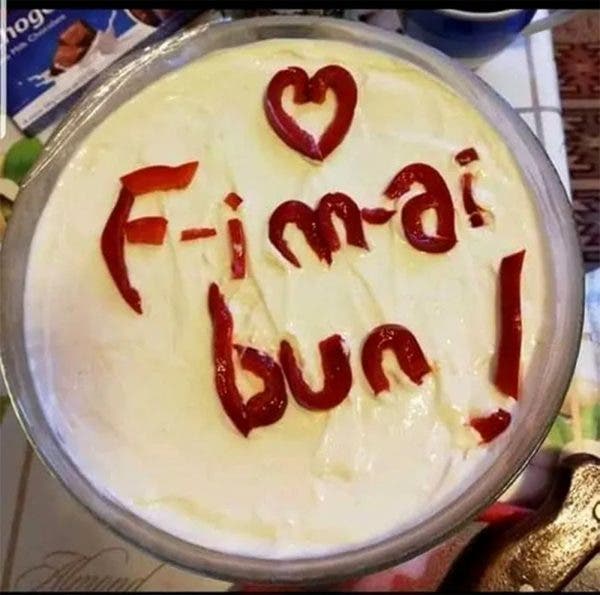 Doar că, în momentul în care a așezat platoul pe masă, în fața invitaților, femeia și-a dat seama de greșeala făcută. Din grabă, emoție sau pur și simplu din neatenție, mesajul a fost scris greșit. În loc de „Fii mai bun!”, pe salată apărea: „F-i m-ai bun!”.