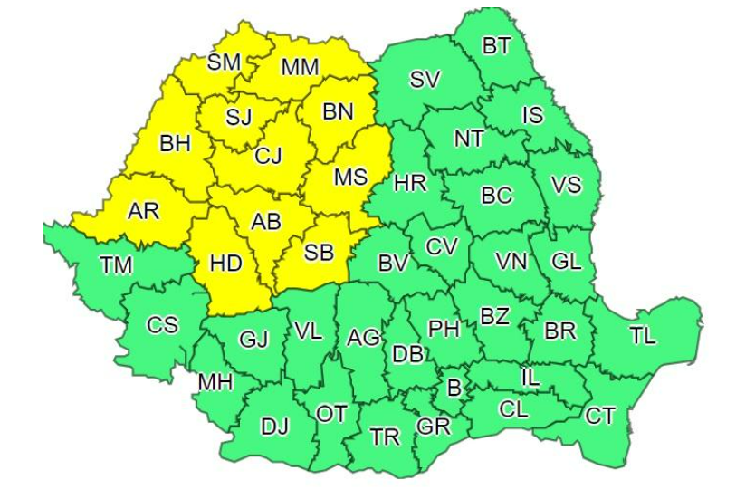 Administrația Națională de Meteorologie a emis luni o avertizare cod galben de vreme severă. Începând cu ora 15:00 și până marți dimineața, 11 județe din nord-vestul țării se află sub avertizare de ploi torențiale, grindină și vijelii.