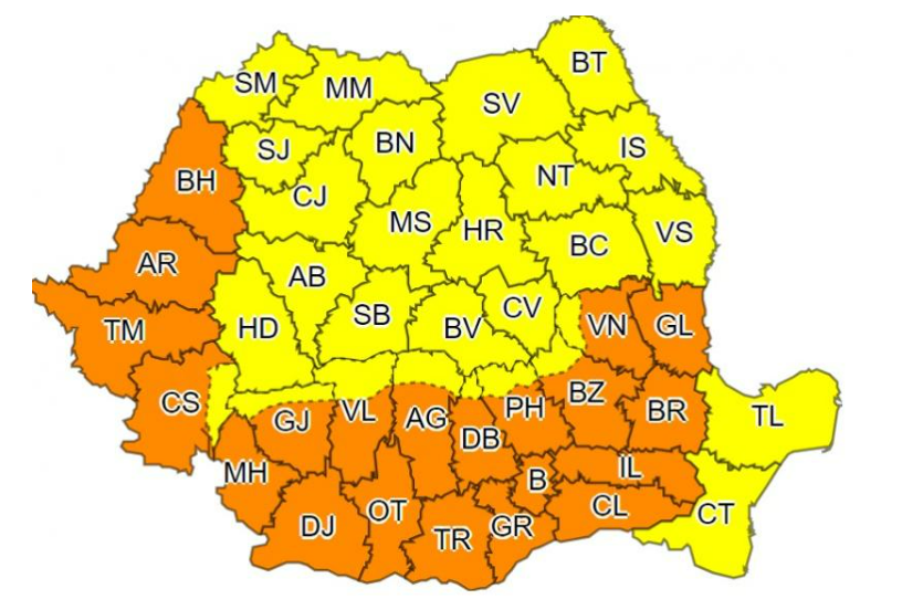 Temperaturile minime se vor situa între 18 și 24 de grade. Codul portocaliu este valabil în județele Bihor, Arad, Timiș, Caraș-Severin, Mehedinți, Gorj, Dolj, Vâlcea, Olt, Argeș, Teleorman, Giurgiu, Ilfov, Prahova, Buzău, Vrancea, Galați, Brăila, Ialomița și Călărași, unde valul de căldură va persista și canicula se va intensifica.