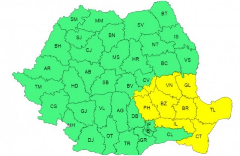 Este valabil și cod galben de vânt puternic. Acesta va bate cu putere în jumătatea de sud a Moldovei, Dobrogea şi în mare parte a Munteniei, cu viteze în general de 40…50 km/h.