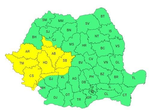 Administrația Națională de Meteorologie (ANM) a emis o alertă cod galben de ploi și vijelii pentru județele din Banat, sudul Crișanei și sud-vestul Transilvaniei. Avertizarea este valabilă de marți, 25 iunie, ora 12.00, până miercuri dimineață, 26 iunie, ora 3.00.