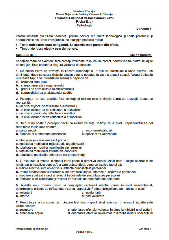Pe 28 iunie 2023, se va desfășura proba la alegere a examenului de Bacalaureat pentru elevii de clasa a XII-a. În cadrul acestui examen, Psihologia este considerată o disciplină opțională. Iată ce subiecte au primit elevii.