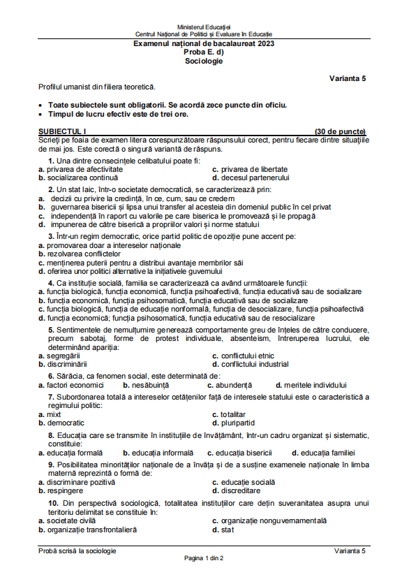 Bacalaureat 2023. Ce subiecte au picat la Sociologie