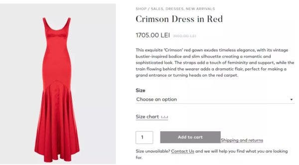 „Această somptuoasă rochie roșie „Crimson” emană o eleganță atemporală. Corsajul inspirat de bustierele vintage și silueta sa suplă creează un look romantic și sofisticat. Bretelele adaugă o notă de feminitate și susținere, iar trena care curge grațios în spatele purtătoarei oferă un aer dramatic, perfect pentru o apariție grandioasă sau pentru a atrage toate privirile pe covorul roșu”, a descrierea rochiei.