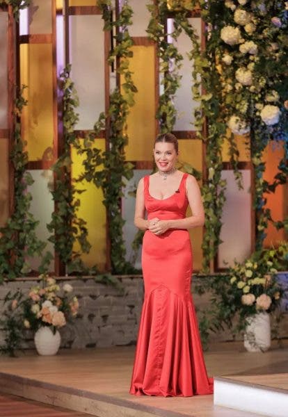 Pentru finală, Gina Pistol a ales o rochie roșie, lungă, cu o croială elegantă și un aer sofisticat. Prezentatoarea și-a prins părul într-un coc, iar machiajul a fost unul rafinat, cu accent pe rujul roșu. Ținuta a fost completată de bijuterii în nuanțe de argintiu, care au pus în valoare întregul look.