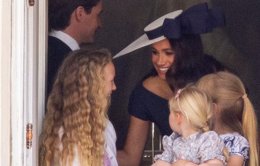 Totuși, paparazzi au reușit să surprindă cadre cu Meghan Markle în interiorul palatului, în timp ce stătea de vorbă cu o parte din nepoții Prințului Harry.