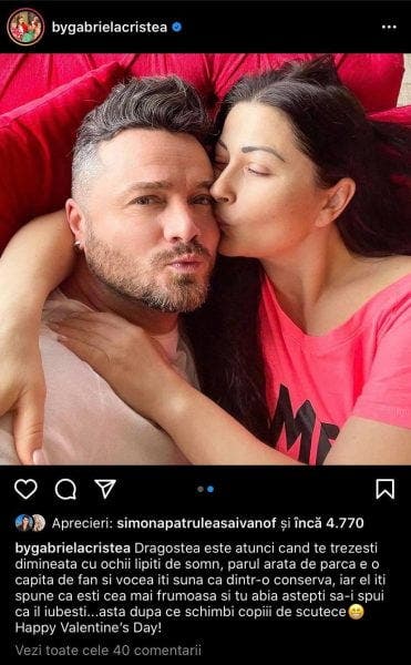 ”Dragostea este atunci cand te trezesti dimineata cu ochii lipiti de somn, parul arata de parca e o capita de fan si vocea iti suna ca dintr-o conserva, iar el iti spune ca esti cea mai frumoasa si tu abia astepti sa-i spui ca il iubesti… asta dupa ce schimbi copiii de scutece😁 Happy Valentine’s Day!”, a scris Gabriela Cristea pe Instagram.