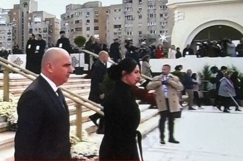 Premierul României a traversat mulțimea de credincioși adunați încă de dimineață pe Dealul Arsenalului, unde zeci de mii de oameni s-au strâns pentru a lua parte la ceremonie. Ilie Bolojan a venit însoțit de o femeie îmbrăcată în negru și de șeful Cancelariei, Mihai Jurca, la slujba de sfințire a picturii Catedralei Naționale
