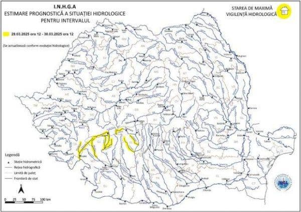 Avertizarea este valabilă din 29 martie până pe 30 martie, la prânz, și vizează în special cursurile de apă din cinci județe: Gorj, Caraș-Severin, Hunedoara, Mehedinți și Vâlcea.