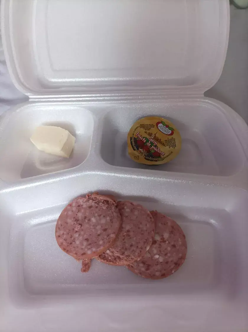 Din imagini putem observa că a primit doar trei felii de salam, o bucățică de unt și un pachet de dulceață. Pe lângă faptul că sunt alimente nesănătoase, nepotrivite unei proaspete mămici, care trebuie să și alăpteze, mai este vorba și despre cantități mult prea mici.