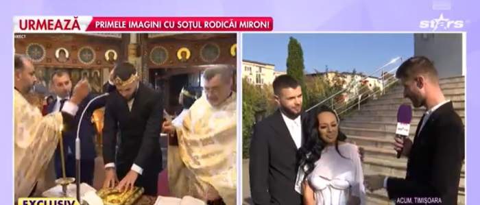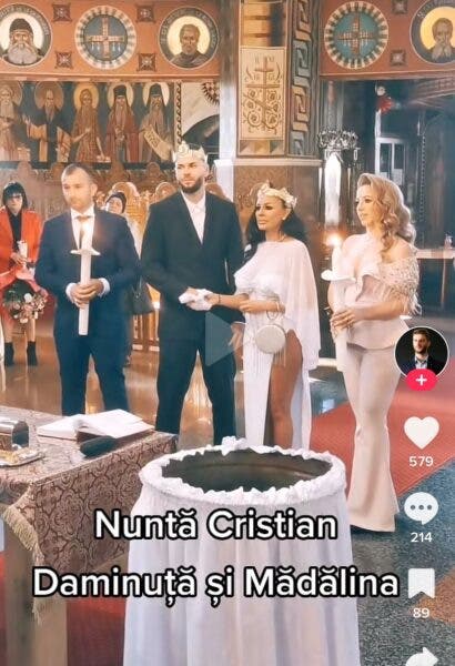 Dar marea surpriză din biserică a fost mireasa: mai bine zis, vestimentaţia ei. Mădălina a apărut cu coapsa stângă la vedere. Rochia, decupată în aşa fel încât să lase tot piciorul stâng descoperit, i-a intrigat, probabil, pe preoţi, care, oficial, n-au zis nimic.