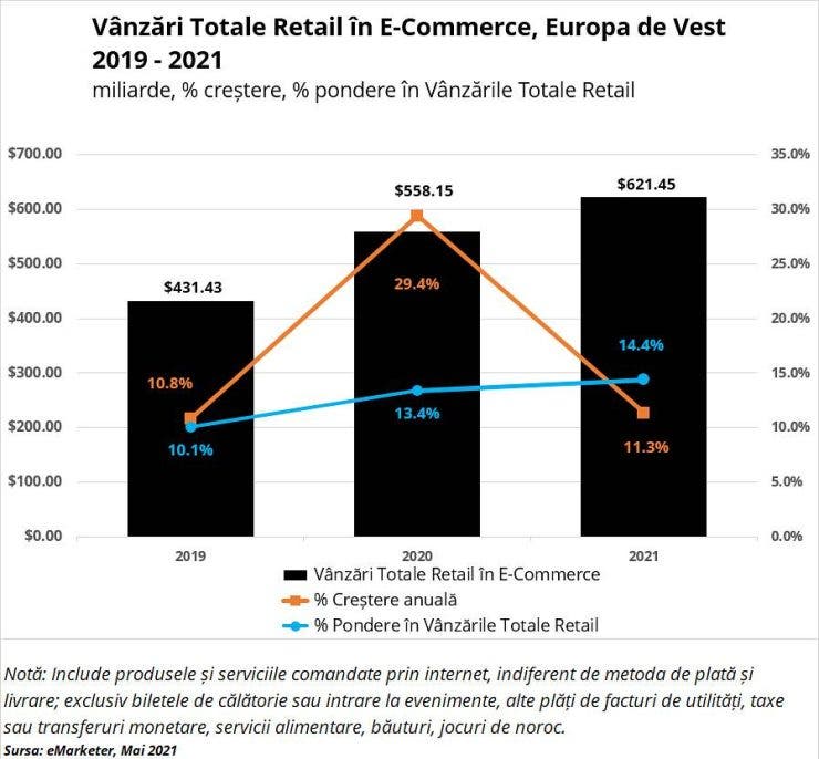 Comerțul online s-a dezvoltat puternic în ultimii ani, fiind accentuat în anii pandemici datorită multiplelor restricții de circulație pe care oamenii le-au întâmpinat. Vizitarea magazinelor fizice pentru diverse achiziții s-a diminuat considerabil, oamenii preferând să cumpere atât cele necesare casei, cât și cele necesare pentru desfășurarea activităților profesionale, la adăpostul relativ sigur al propriei locuințe sau de la birou. Multiplele gadget-uri din ce în ce mai performante, tehnologiile moderne IT și internetul de mare viteză au avut și ele partea lor de contribuție la creșterea sectorului de e-commerce, care a înregistrat o creștere anuală susținută, ajungând până la 621.45 miliarde de USD în 2021, date înregistrate pentru Europa de Vest.