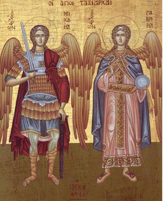 Sfinții Arhangheli Mihail și Gavril sunt considerați mari conducători ai cetelor îngerești. În iconografia ortodoxă, Mihail este războinicul ceresc, apărătorul binelui și biruitor al forțelor întunericului. El poartă sabie de foc, simbol al dreptății și al curajului divin. Gavril este mesagerul veștilor bune, cel care a vestit Fecioarei Maria nașterea Mântuitorului.