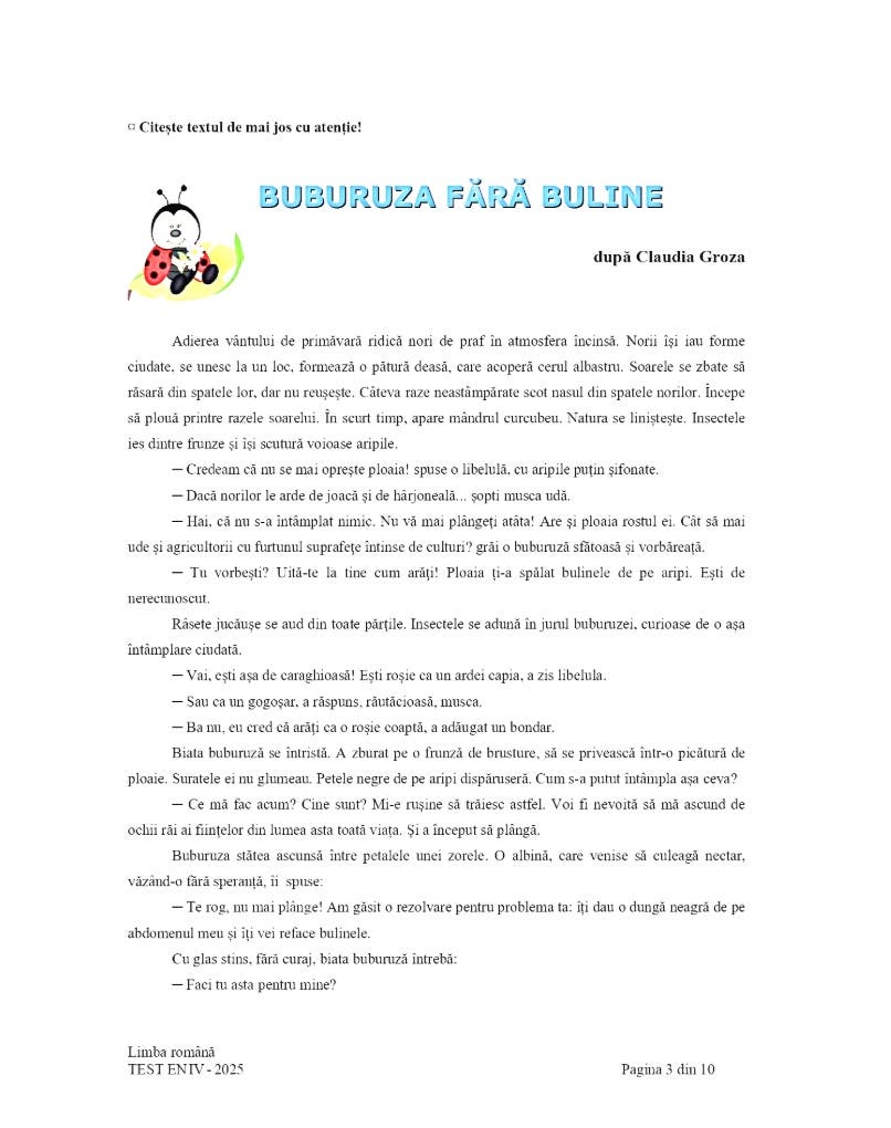 Textul-suport propus în cadrul probei a fost intitulat „Buburuza fără buline”, o poveste semnată de Claudia Groza, cunoscută pentru scrierile sale destinate copiilor. Pe baza textului, elevii au avut de rezolvat mai multe cerințe, menite să le testeze capacitatea de lectură, înțelegere și exprimare scrisă.