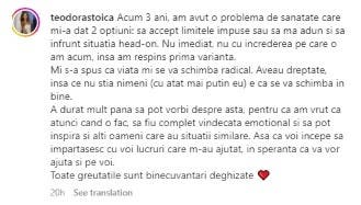 Acum, după ce a învins boala, Teodora Stoica a postat pe rețelele de socializare un mesaj emoționant, deși nu a dezvăluit foarte multe detalii, însă a promis că pe viitor va face acest lucru: