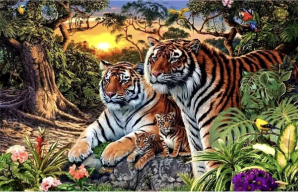 Fotografia pare să fi fost produsă ca un poster ce are ilustrată în prim-plan doi tigri adulţi şi doi pui. Nimic inofensiv până acum!