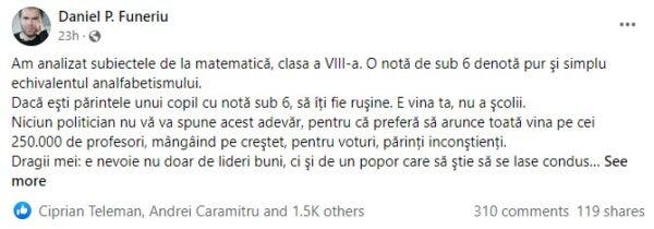 Fostul ministru al Educației, Daniel Funeriu a făcut o afirmație puternică pe contul personal de socializare, Facebook. Omul politic afirmă că a analizat subiectele de la matematică date anul acesta la Evaluare Natională și că „cine nu are minim 6 este pur şi simplu echivalentului analfabetismului”, dar și că reala vină este a părinților, nu a școlii și a profesorilor: