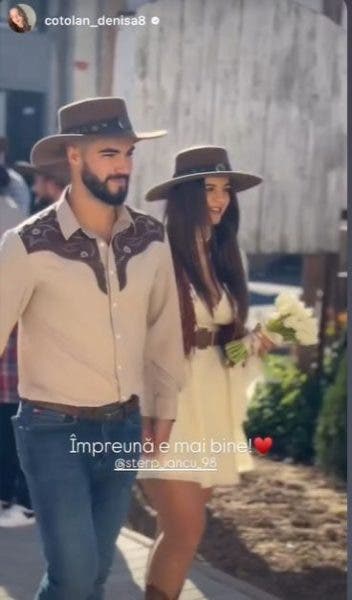 Pentru ziua cea mare, Iancu Sterp și Denisa Coțolan au purtat obiecte vestimentare inedite. Au abordat o tematică vestimentară, cea cowboy. Mai exact, tânăra a îmbrăcat o rochiță albă, scurtă, la care a asortat o pălărie maro și cizme în aceeași nuanță.