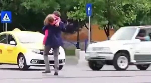Nicușor își pune în pericol copilul traversând printre mașini.