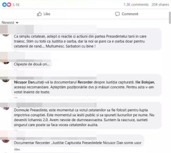 Pe pagina președintelui, ultima postare – dedicată unei vizite oficiale în Franța – a fost imediat asociată cu investigația Recorder. În comentarii, utilizatorii au insistat ca acesta să urmărească documentarul și să își exprime public poziția. „Poate aveți timp să vedeți unde este România. Uitați-vă la ultimul documentar Recorder!”, a scris cineva. „Pe avion spre casă, vă recomandăm noul documentar Recorder!”, adaugă alt utilizator.