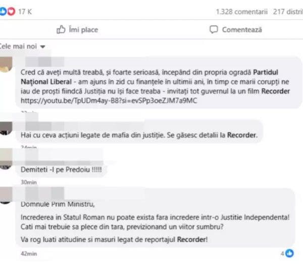 Și premierul Ilie Bolojan se confruntă cu aceeași presiune publică. Comentariile de pe pagina sa cer intervenții rapide: „Hai cu ceva acțiuni legate de mafia din justiție. Se găsesc detalii la Recorder.” „Vă rog luați atitudine legat de reportajul Recorder!” Unii îi reamintesc că reformarea justiției începe chiar din interiorul partidului: „Aveți multă treabă în propria ogradă. Invită tot Guvernul la un film Recorder.”