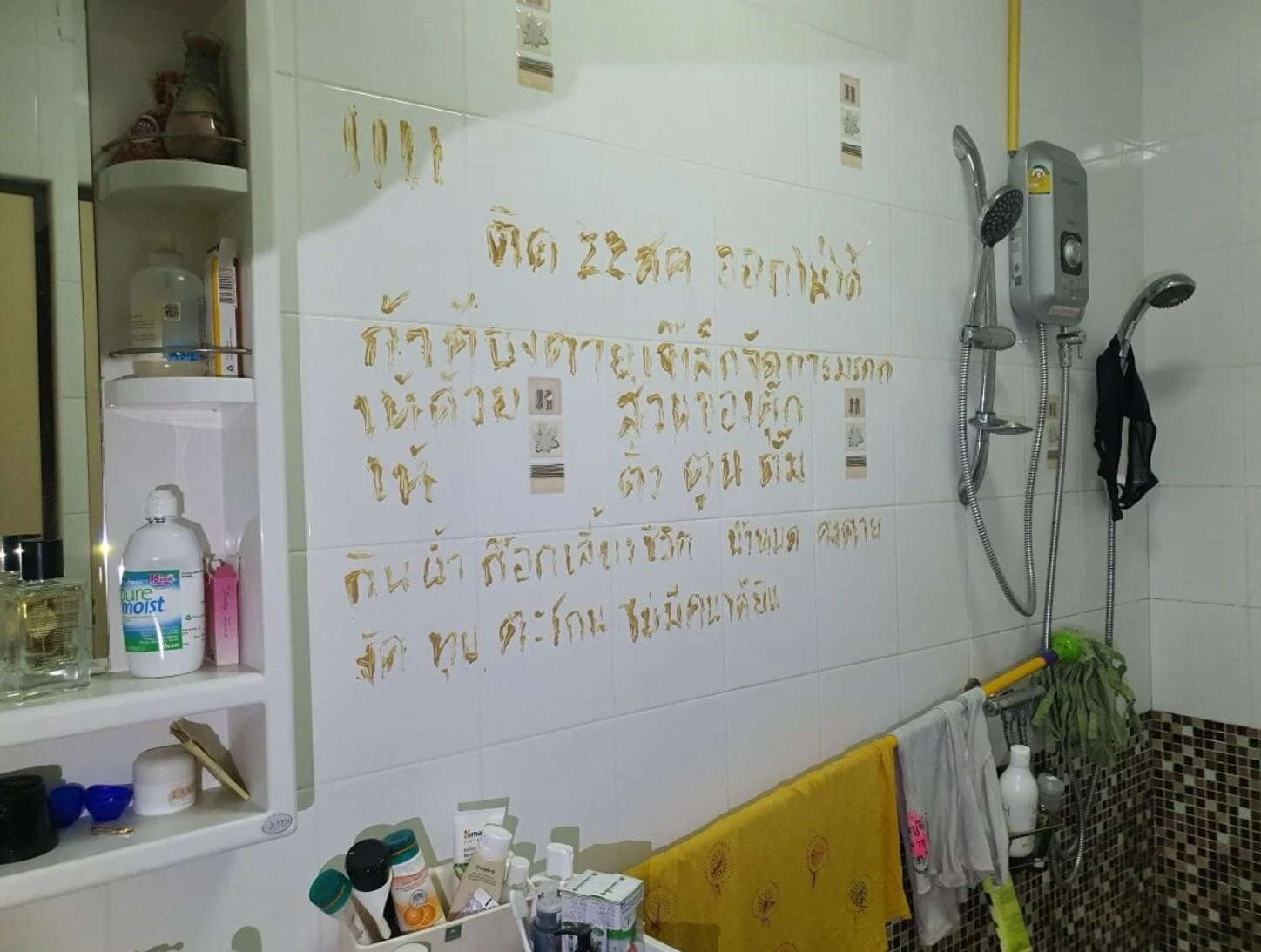 „Sunt blocată în toaletă din 22 august. Dacă mor, vă rog să-l lăsați pe Jay Lek să se ocupe de testamentul meu. Vă rog să dați proprietatea lui Tuk lui Tua Toon Tum. Am băut apă de la robinet pentru a supraviețui. Fără apă, aș fi mort. Am încercat să mă forțez și să sparg pentru a ieși, am încercat să strig, dar nu m-a auzit nimeni”, relatează thethaiger.com