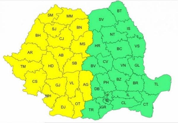 Administrația Națională de Meteorologie a emis miercuri o avertizare cod galben de vreme severă, valabilă pentru mai bine de jumătate din teritoriul României. Începând cu ora 12:00 și până la 23:00, mai multe regiuni se vor confrunta cu fenomene meteo extreme: ploi torențiale, vânt puternic, grindină și frecvente descărcări electrice.