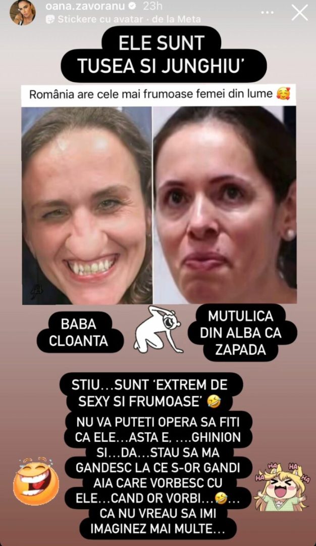 Actrița a publicat recent un colaj în care apar cele două, însoțit de o serie de remarci ironice. În mesajul postat, Zăvoranu le-a atribuit porecle inspirate din personaje de poveste și a comentat aspectul lor fizic: