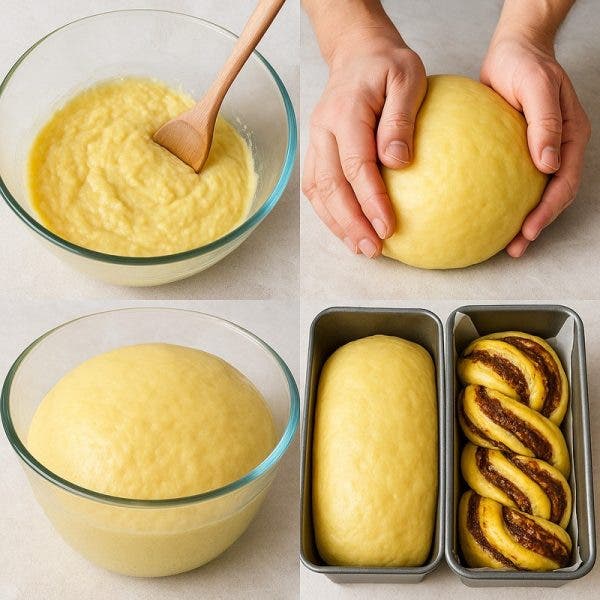 Separat, drojdia se dizolvă cu o lingură de zahăr și puțin lapte călduț, apoi se adaugă peste aluatul opărit. Se încorporează gălbenușurile frecate cu sare, restul de zahăr, aromele și, treptat, restul de făină. Frământarea este esențială și trebuie făcută cu răbdare, timp de cel puțin 25–30 de minute.