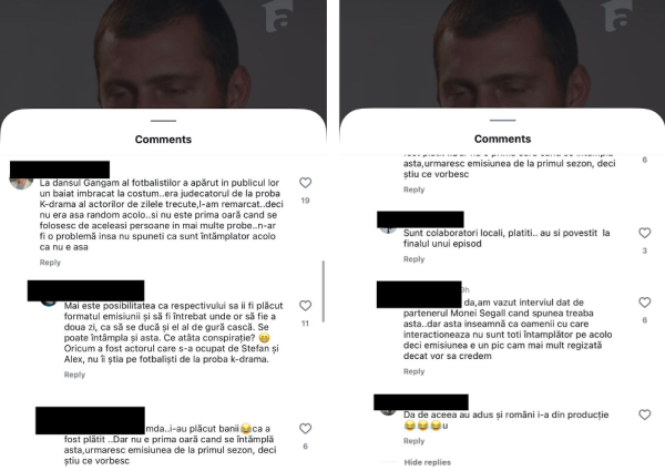 „Mai este posibilitatea ca respectivului să îi fi plăcut formatul emisiunii și să fi întrebat unde or să fie a doua zi, ca să se ducă și el, așa, de gură-cască. Se poate întâmpla și asta. Ce atâta conspirație? Oricum a fost actorul care s-a ocupat de Ștefan și Alex, nu îi știa pe fotbaliști de la proba K-drama”, a reacționat alt telespectator.