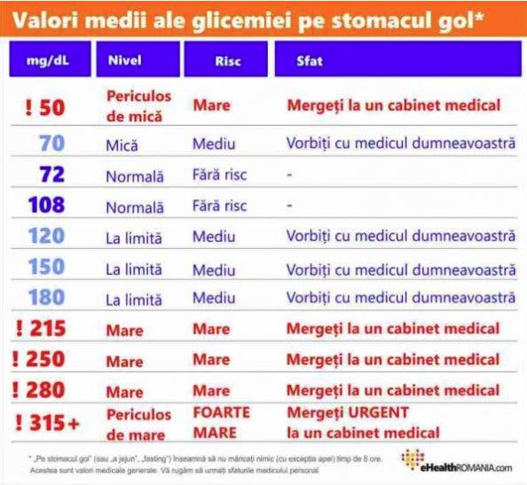 Iată și un tabel care vă poate ajuta să vă orientați mai bine cu valorile medii ale glicemiei pe stomacul gol.