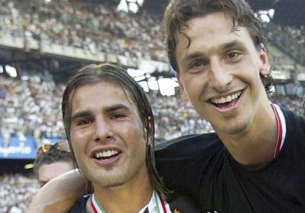 TURIN, ITALY - MAY 29: Adrian Mutu (L) and Zlatan Ibrahimovic of Juventus celebrate with the trophy at the end of the last Serie A football match of the season between Juventus and Cagliar in Delle Alpi Stadium May 29, 2005, in Turin, Italy. (Photo by Giuseppe Cacace/Getty Images)